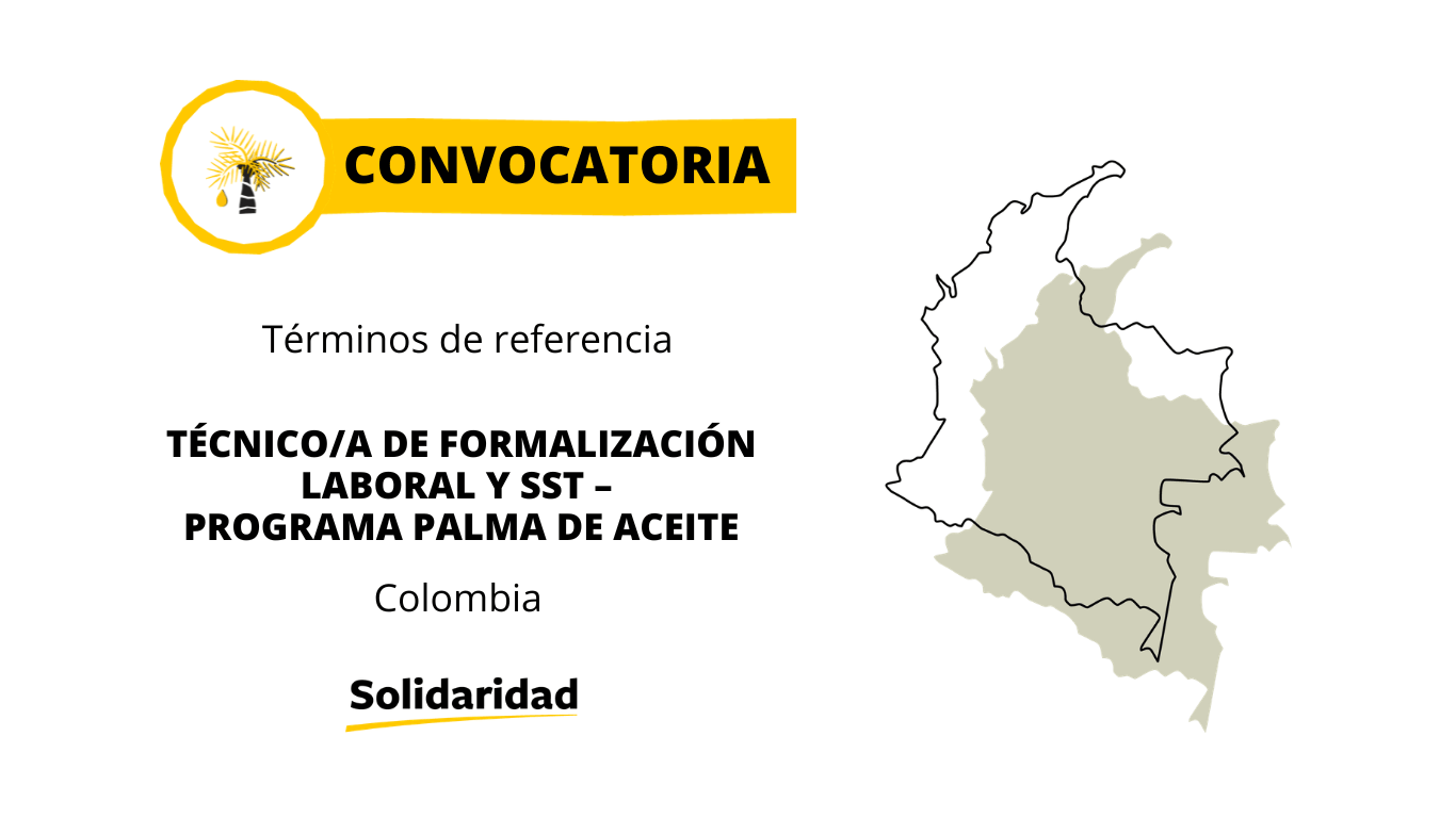 La oficina en Colombia busca un(a) Técnico(a) de Formalización Laboral y SST Programa Palma de Aceite quien se encargará de brindar acompañamiento técnico a productores de palma de aceite en la implementación integral de procesos de formalización laboral. La ubicación del puesto es Departamento del Cesar y Guajira (con disponibilidad de desplazamiento en zona rural), dentro de Colombia.